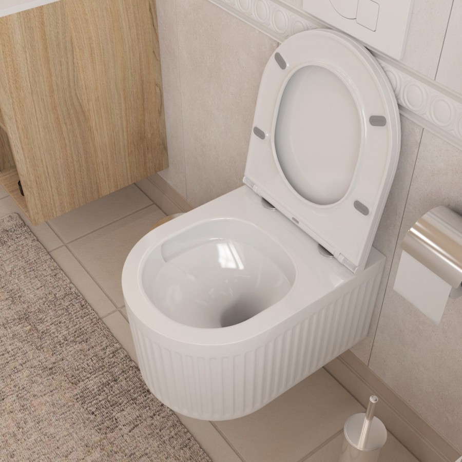 В комплектацию входит премиум-сиденье из долговечного дюропласта, оснащенное механизмом плавного опускания. Функция микролифта предотвращает случайные удары и шум при закрывании крышки. Задний подвод воды и необходимость установки инсталляции создают современный минималистичный образ санузла.