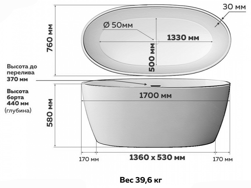 -- Тип изделия: ванна отдельностоящая;